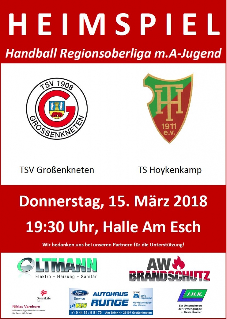 Aufgrund einer Spielverlegung findet am Donnerstagabend in der Sporthalle Am Esch ein Handballspiel der Regionsoberliga statt. Die männliche A-Jugend des TSV Großenkneten empfängt die Mannschaft der TS Hoykenkamp.