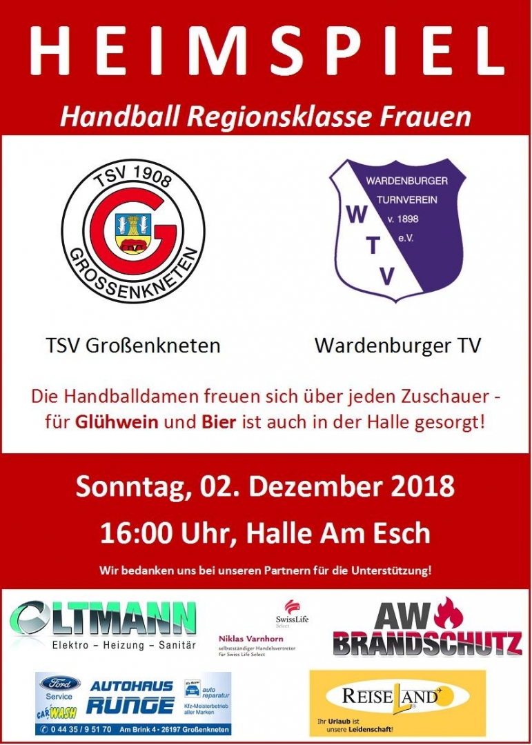 Am Wochenende findet in Großenkneten die traditionelle Nikolausmeile statt. Wer sich während seines Bummels über die Meile aufwärmen möchte, ist herzlich eingeladen, dies in der Halle Am Esch zu tun. Dort werden die Handballdamen des TSV um 16.00 Uhr die Gäste des TV Wardenburg empfangen. Die Wardenburger sind in der Tabelle unmittelbarer Konkurrent des TSV, weswegen die Mannschaft von Trainer Renke Wessels fest entschlossen ist zu gewinnen. Die Damen freuen sich über jeden Zuschauer, der sie anfeuert und sorgen daher auch für Glühwein und Getränke in der Halle.
