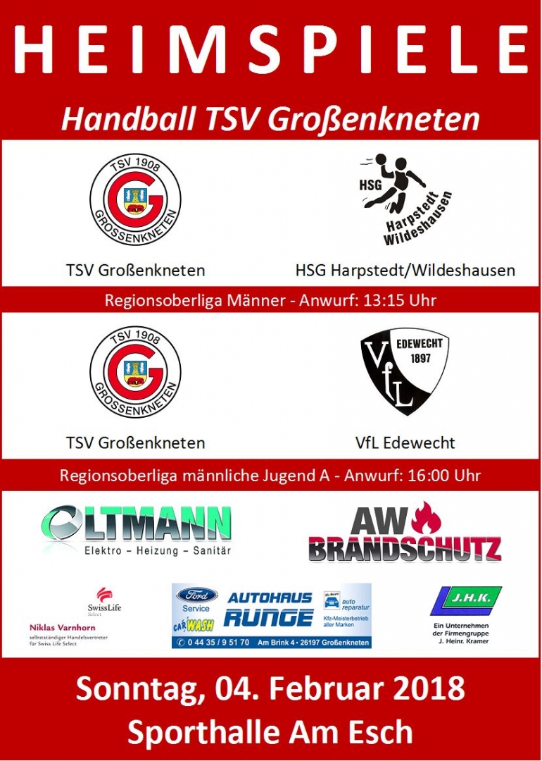 Am kommenden Sonntag stehen für die Handballer des TSV Großenkneten zwei wichtige Heimspiele an. Ausnahmsweise machen die Herren den Anfang und empfangen um 13.15 Uhr die HSG Harpstedt/Wildeshausen. Die Spiele gegen die HSG haben für den TSV immer einen Derby-Charakter. Dementsprechend ist die Mannschaft von Trainer Helge Schomacker heiß und freut sich schon auf die Partie. Außerdem ist man fest entschlossen die Siegesserie der letzten Spiele fortzusetzen und somit die 20:16 Niederlage aus dem Hinspiel wieder wett zu machen.